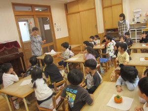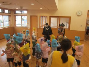 「トリックオアトリート!」と大きな声で言う練習をし、無事お菓子を受け取ることが出来て嬉しそうな子ども達でした