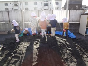 園庭の砂場に、たくさんの砂が入り、