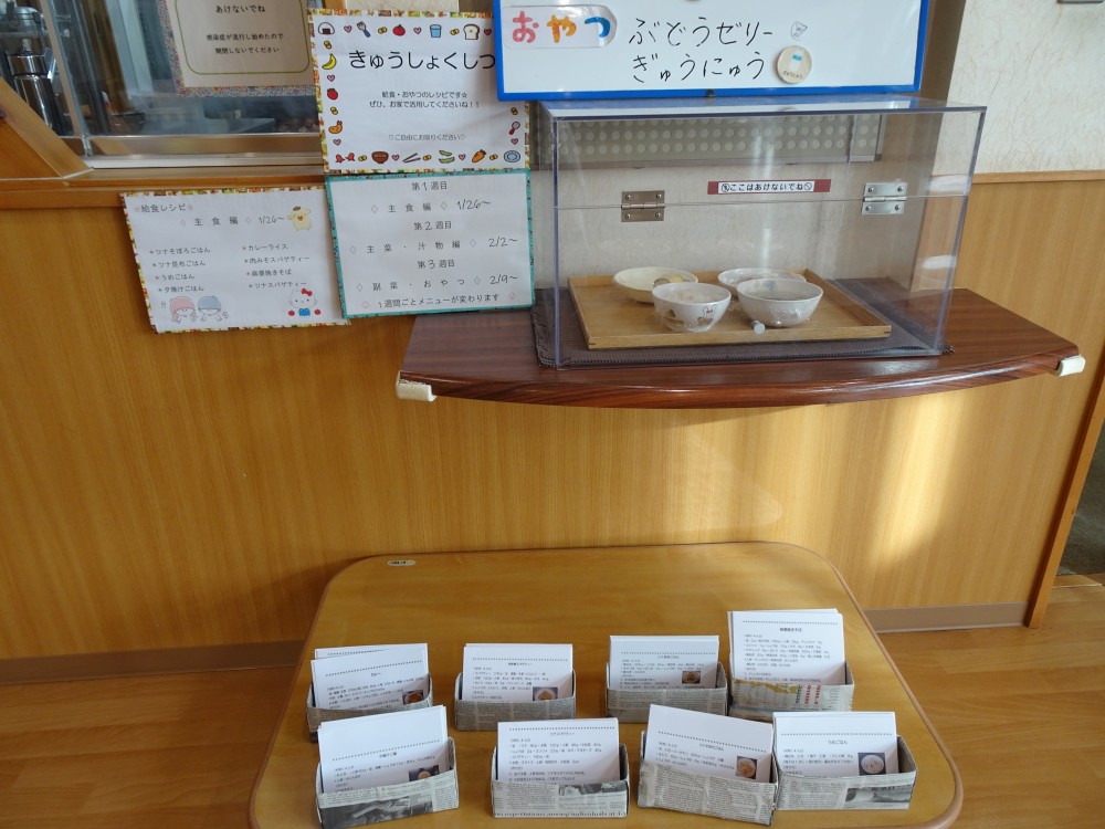 また、給食室前には給食のレシピが置いてあります。 子どもたちに人気のメニューばかりです!