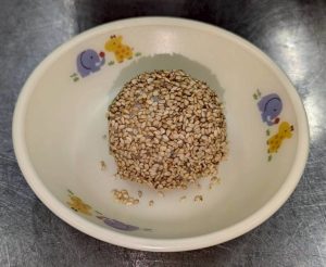 ご飯の中にあんこを入れて丸く包み、表面に白ごまをまぶしました。
